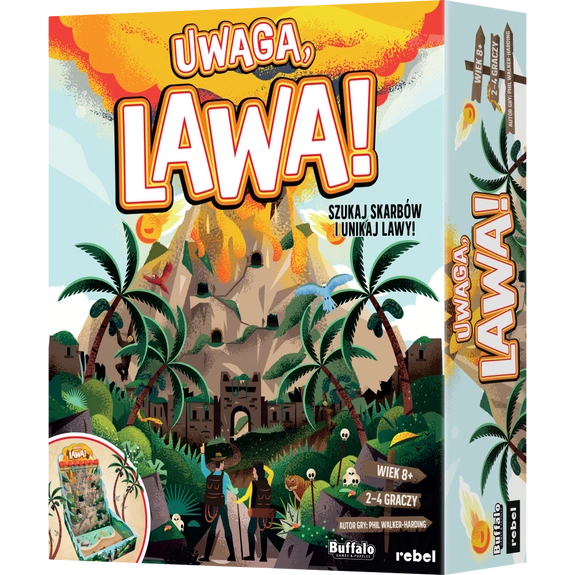 Uwaga, lawa! to prosta i wciągająca gra dla całej rodziny, w której wcielamy się w dzielnych poszukiwaczy skarbów. Podczas zabawy będziemy zagrywać karty i wykonywać akcje, unikając przy tym kul lawy toczących się po zboczu góry. Zwycięży osoba, która jako pierwsza wypełni swój plecak!